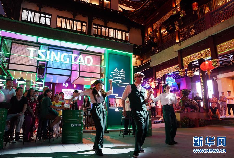 7月3日,游人在上海豫园中心广场观看街舞表演。 从7月第一个周末起,上海豫园原有的“豫园六点半”集市全面升级,焕彩灯光、演艺活动和花车集市全线更新,让市民和游客在观灯、观人、观演的沉浸式体验中,享受夏日特色的“食玩”乐趣。 新华社记者 刘颖 摄