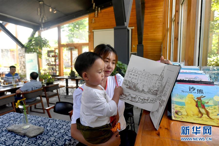 在陕西留坝县火烧店镇云溪阿凌客栈内,一对母子在翻阅绘本(7月2日摄)。新华社记者 刘潇 摄
