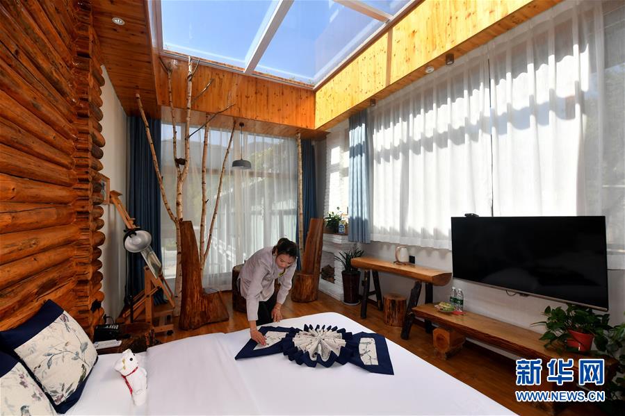 在陕西留坝县城城郊的星月空间民宿内,工作人员在整理床铺(7月2日摄)。新华社记者 刘潇 摄