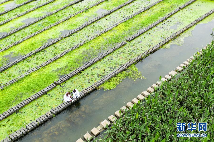 7月3日,检测人员对泗洪县尾水湿地公园的水质进行取样检测(无人机照片)。 江苏省宿迁市泗洪县在城北污水处理厂周边建设占地280多亩的尾水湿地公园,公园包括生态塘、表流湿地区、沉水植物区等,污水处理厂的尾水在这里经再次净化提质达到地表准Ⅳ类水后,作为生态补水排入河道。尾水湿地公园“吞”污水“吐”清水,不但能给河道补水,还因环境优美吸引周边居民来这里休闲健身。 新华社发(许昌亮 摄)