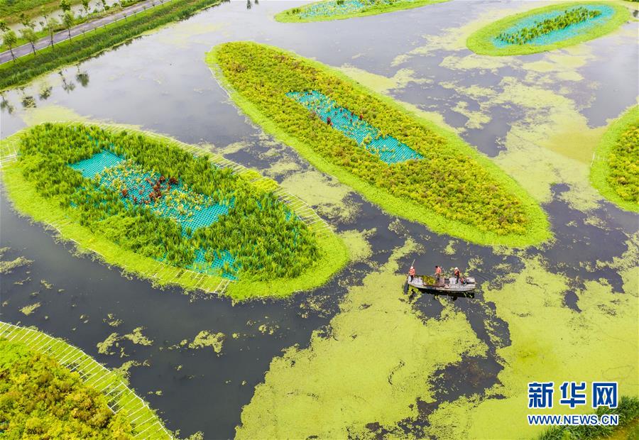 7月3日,工作人员对泗洪县尾水湿地公园人工浮岛上的水生植物进行养护管理(无人机照片)。 江苏省宿迁市泗洪县在城北污水处理厂周边建设占地280多亩的尾水湿地公园,公园包括生态塘、表流湿地区、沉水植物区等,污水处理厂的尾水在这里经再次净化提质达到地表准Ⅳ类水后,作为生态补水排入河道。尾水湿地公园“吞”污水“吐”清水,不但能给河道补水,还因环境优美吸引周边居民来这里休闲健身。 新华社发(许昌亮 摄)