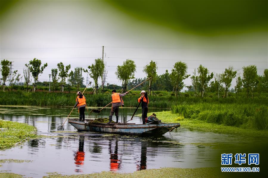 7月3日,工作人员在泗洪县尾水湿地公园生态塘打捞漂浮物。 江苏省宿迁市泗洪县在城北污水处理厂周边建设占地280多亩的尾水湿地公园,公园包括生态塘、表流湿地区、沉水植物区等,污水处理厂的尾水在这里经再次净化提质达到地表准Ⅳ类水后,作为生态补水排入河道。尾水湿地公园“吞”污水“吐”清水,不但能给河道补水,还因环境优美吸引周边居民来这里休闲健身。 新华社发(许昌亮 摄)