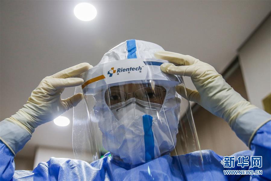 7月3日,中日友好医院检验科新冠核酸检测实验室的检验人员闫克芹在进入污染区前穿戴防护装备。新华社记者 张玉薇 摄