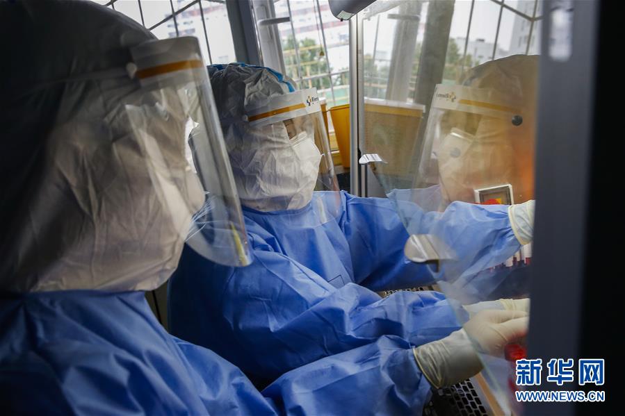 7月3日,中日友好医院检验科新冠核酸检测实验室的检验人员闫克芹(右)和张鑫在实验室内处理刚刚送到的样本。新华社记者 张玉薇 摄