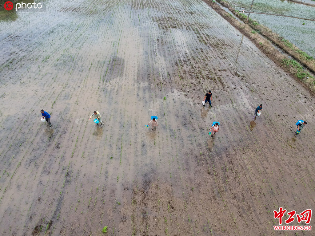 2020年7月5日,在江苏省如皋市长江镇万顷良田,村民们在田间给秧苗施肥。徐慧/IC photo