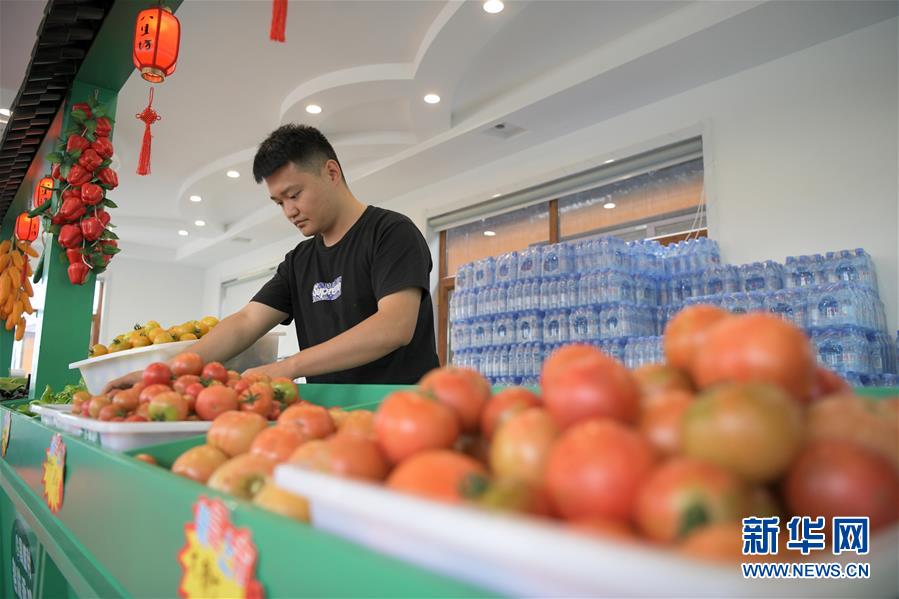 7月5日,在黑龙江省肇东市昌五镇昌盛村农业生态观光园农产品展销区,工作人员在整理果蔬。 黑龙江省肇东市昌五镇昌盛村农业生态观光园占地千余亩,融合了种植采摘、民俗产品展销、旅游观光等项目,方便周边农民就近就业,助力脱贫增收。 新华社记者 王建威 摄