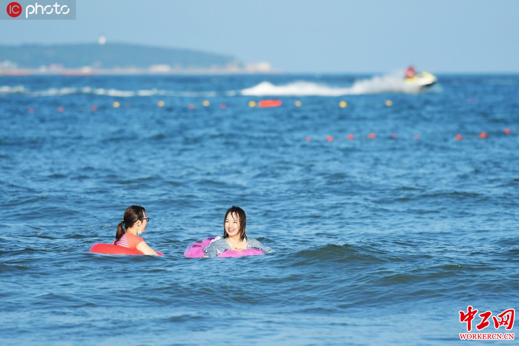 2020年7月4日,山东青岛西海岸新区金沙滩海水浴场,游客在海水中享受清凉。俞方平/IC photo