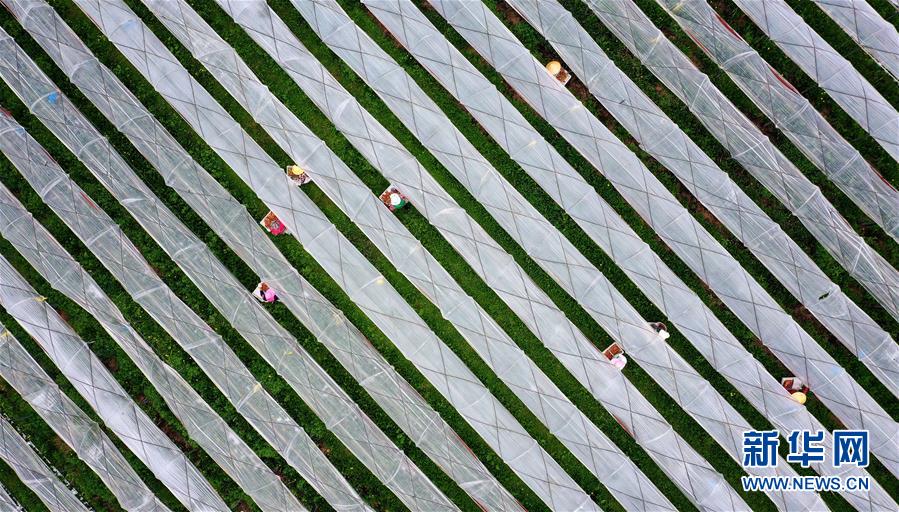 工人在陕西太白县咀头镇拐里村海升现代莓类产业示范园内采摘高架栽培草莓(7月5日摄,无人机照片)。该示范园目前有600余亩莓类种植基地,通过入园务工、土地流转、辐射引领等方式带动群众增收。 近年来,地处秦岭腹地的陕西省太白县充分利用山地多、海拔高、昼夜温差大等生态资源优势,大力发展莓类产业,形成组培育苗、大田示范、冷链储运、体验采摘等莓类产品开发全产业链。2020年,当地共种植蓝莓、草莓、树莓等2000余亩,预计产值近2亿元。 新华社记者 刘潇 摄