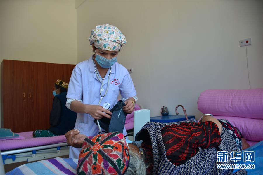 在幸福大院内,乌恰镇卫生院的医务人员帮老人检查身体(7月3日摄)。 新华社记者 高晗 摄