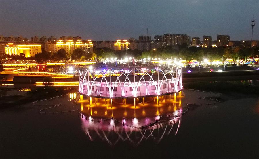 7月4日拍摄的江苏省金湖县荷花广场夜景(无人机照片)。 江苏省淮安市金湖县位于江苏省中部,境内白马湖、宝应湖、高邮湖三面环绕。近年来,当地发挥其独特的地理区位优势,打造出金湖龙虾广场、尧帝古城小吃街、荷花广场便民服务点等一批特色区域,丰富当地群众夜生活。 新华社发(孟德龙 摄)