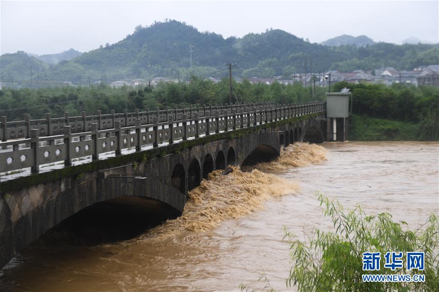 位于杭州市临安区潜川镇的天目溪超警戒水位(7月6日摄)。 当日,浙江省杭州市提升防汛应急响应至Ⅲ级。近期的连续降雨使杭州各河道水位上涨,其中临安区全区河道干流2个超警戒、全区大中型水库6个超汛限水位。目前,临安区水利水电局等多部门迅速组织专家和相关工作人员24小时值班备勤,合理调度,确保水情、险情及时上报。同时,相关部门加强了河道巡查检查、防汛物资运输调配、指导群众紧急避险等工作,保障群众生命财产安全。 新华社记者 徐昱 摄