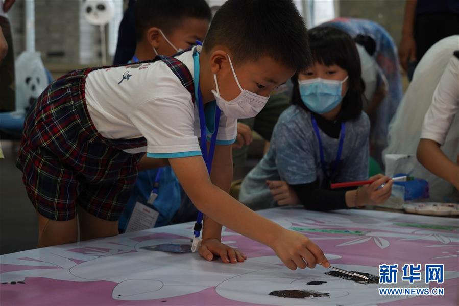 7月6日,在中国大熊猫保护研究中心都江堰青城山基地,小朋友们为“圆仔”绘制生日祝福海报。 新华社发(胥冰洁 摄)
