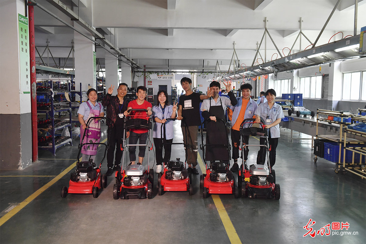 2020年5月27日,在宁波大叶园林设备股份有限公司车间拍摄的罗顺芝、徐林辉、李学兵、文才会、黄帮生、刘官宏、韦飞、杨翠(从左至右)。(陈斌荣 摄/光明图片)