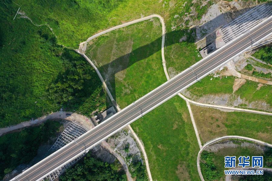 7月6日拍摄的安六铁路彭家冲一号大桥(无人机照片)。 当日,新建贵州安六铁路(安顺至六盘水)联调联试工作进入收尾阶段,开通前的各项准备工作已基本就绪。安六铁路线路全长约125公里,设计时速250公里,为国家I级双线客运专线。建成投用后,贵阳至六盘水的铁路旅行时间可从现在的3.5小时缩短为1小时左右,贵州省六盘水市将全面接入全国高铁网。 新华社记者 刘续 摄