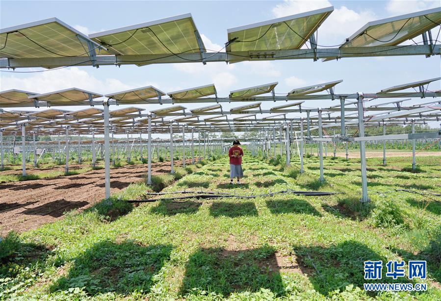 徐亚茹在德胜村“农光互补”项目区光伏发电板下查看种植的药材长势(6月23日摄)。 新华社记者 牟宇 摄