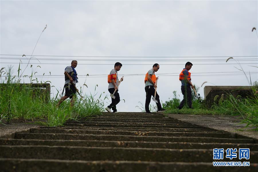 7月6日,南昌市东湖区扬子洲镇渔业村的防汛人员在巡查堤坝。 连日来,为应对赣江江西南昌段沿岸因强降雨造成的防汛压力,南昌市东湖区扬子洲镇加大防汛工作力度,增加巡堤防汛人员和巡堤频次,清理杂草、灌木,储备防汛物资,以保安全度汛。 新华社记者 周密 摄