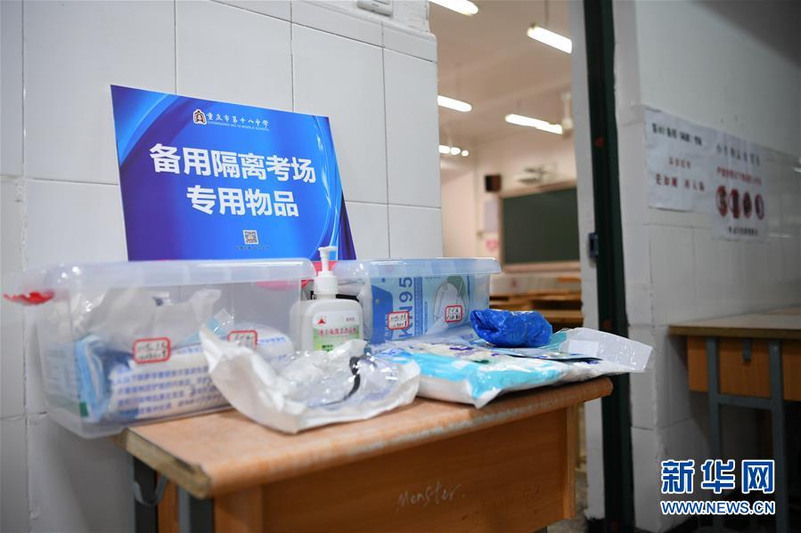 这是重庆市江北区十八中考点备用隔离考场门口放置的专用物品(7月6日摄)。 2020年全国高考即将拉开帷幕,各地考生来到考点提前熟悉环境,从容应对考试。 新华社记者 唐奕 摄