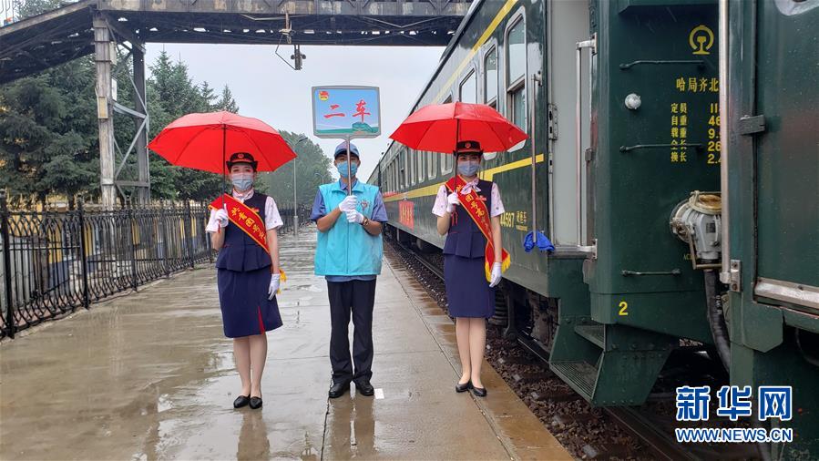 7月6日,在内蒙古自治区呼伦贝尔市鄂伦春自治旗的大杨树站,铁路工作人员站在“高考专列”外等待考生上车。新华社发