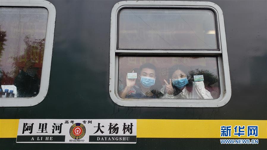 7月6日,在内蒙古自治区呼伦贝尔市鄂伦春自治旗的大杨树站,考生在“高考专列”内打招呼。新华社发