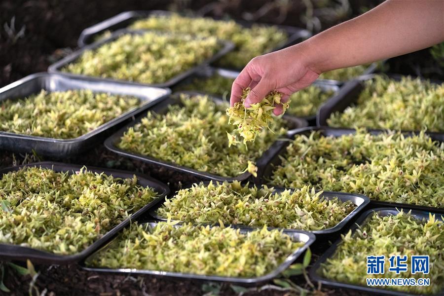 7月6日,唐山市丰润区泉河头镇罗文口村聚福缘家庭农场的工人在晾晒铁皮石斛花。 新华社记者 牟宇 摄