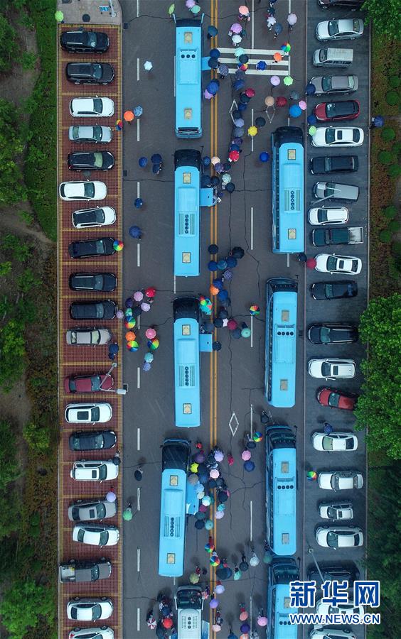 7月6日,在山东荣成第二中学校门口,学生们乘坐“爱心送考专线”前往考场熟悉环境(无人机照片)。 2020年全国高考即将拉开帷幕,各地纷纷做好各项准备迎接高考的到来。 新华社发(李信君 摄)