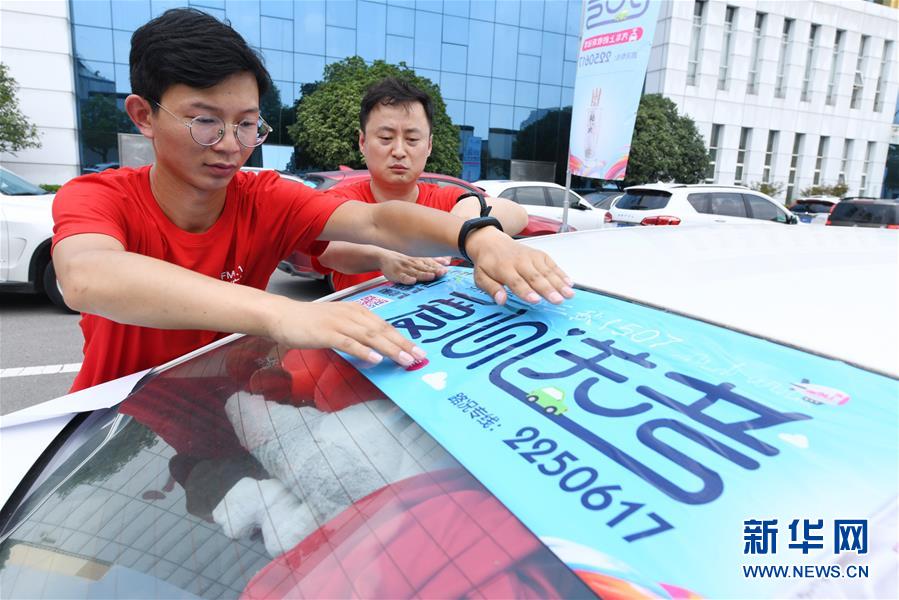 7月5日,安徽省阜阳市参加爱心送考的私家车主将“爱心送考”标识张贴在车上。 2020年全国高考即将拉开帷幕,各地纷纷做好各项准备迎接高考的到来。 新华社发(王彪 摄)