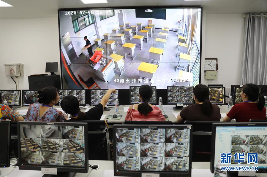 7月6日,湖南省永州市道县第一中学考点的工作人员在调试监控设备。 2020年全国高考即将拉开帷幕,各地纷纷做好各项准备迎接高考的到来。 新华社发(何红福 摄)