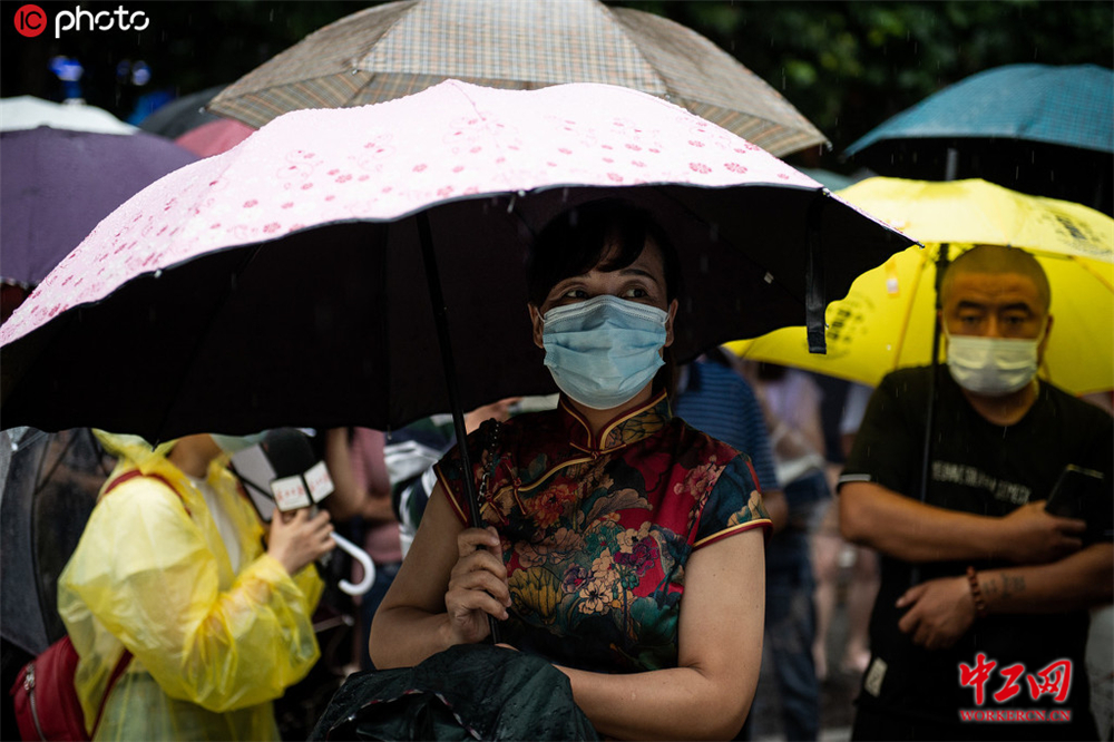 2020年7月7日,上午11:30,随着散场铃声响起,2020高考语文科目考试结束,武汉考生家长们在考点外撑着伞有序等待学生走出考场。