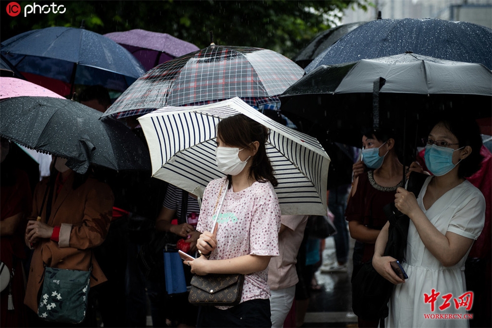 2020年7月7日,上午11:30,随着散场铃声响起,2020高考语文科目考试结束,武汉考生家长们在考点外撑着伞有序等待学生走出考场。