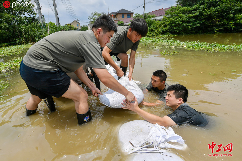 2020年7月7日,浙江省湖州市长兴县夹浦镇环沉村,党员志愿者抢险队员在约1.5米深的水中整理沙袋,堆筑堤坝。