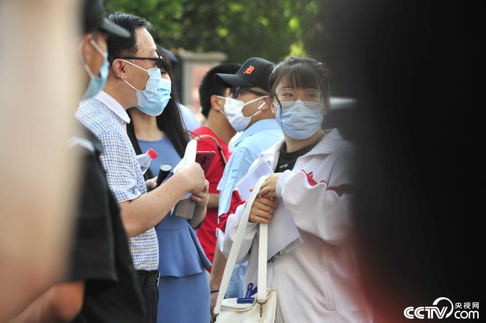 在中国人民大学附属中学考点外,考生准备步入考场。
