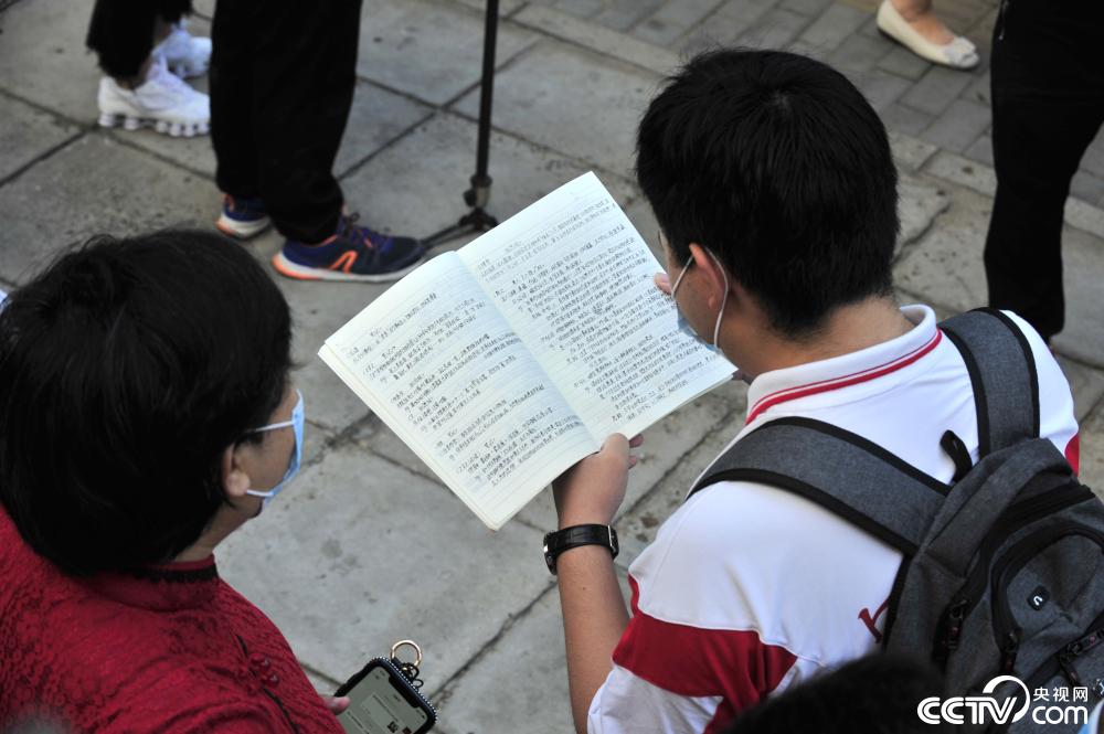 在中国人民大学附属中学考点外,考生在紧张备考。