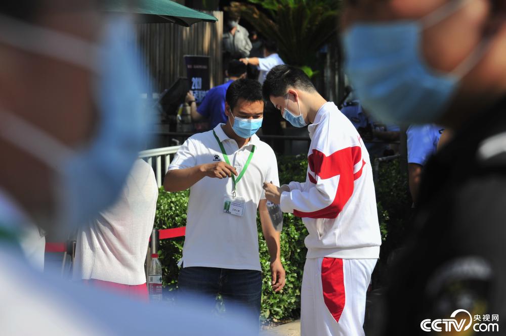 在中国人民大学附属中学考点,考务人员在查验考生准考证。
