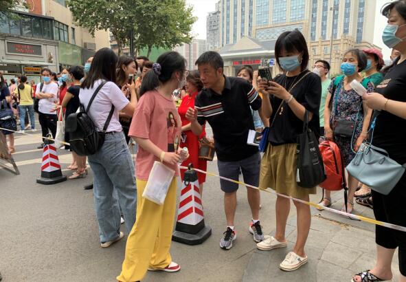 7月7日,成都市武侯区成都七中校门口隔离线外,刚步入考场的女儿又转身走向父亲,父亲递过手中的水,父亲最后叮嘱几句,又目送女儿前往考场。(记者 李娜 实习生 何宴彬)
