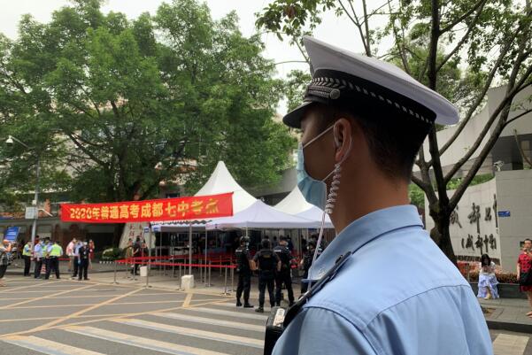 7月7日,成都交警配合学校维护高考安全工作,为高考保驾护航。(记者 李娜 实习生 何宴彬)