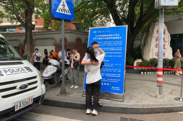 7月7日,成都市武侯区成都七中考场入口边,父亲送考与女儿拥抱,女儿步入考场前再次转身踮起脚尖与父亲拥抱。(记者 李娜 实习生 何宴彬)
