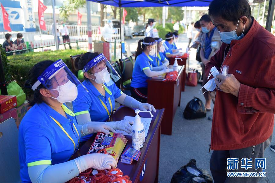 7月7日,在北京新发地市场,解除隔离人员(右)在办理取车取物的登记。新华社记者 彭子洋 摄