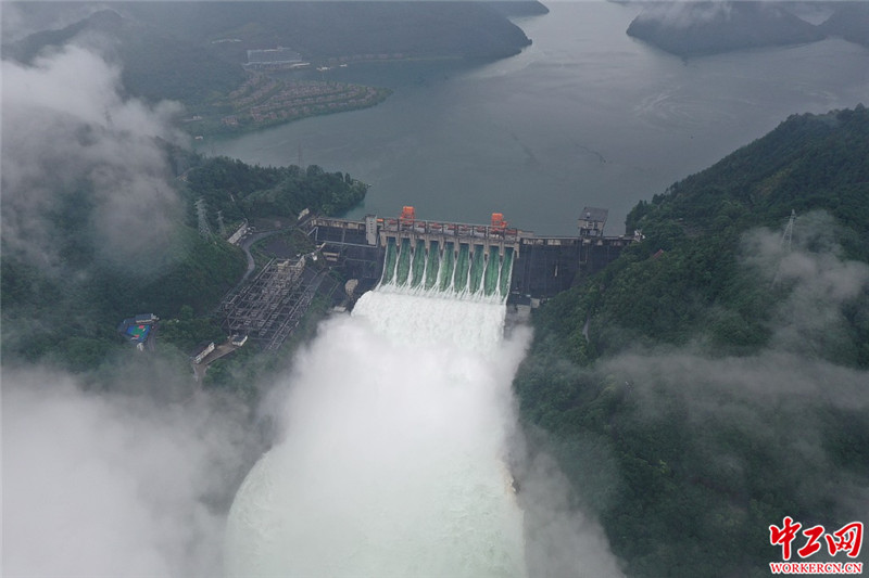2020年7月8日,杭州,航拍新安江水库开启9孔泄洪闸泄洪。方建飞/人民视觉