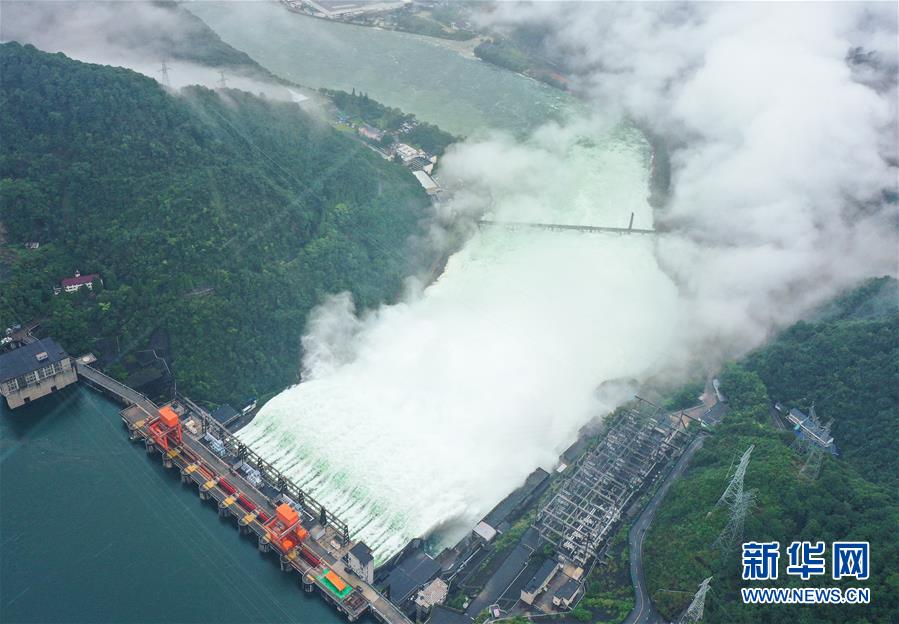 7月8日开启9孔泄洪的新安江水库(无人机照片)。 新华社记者 翁忻旸 摄