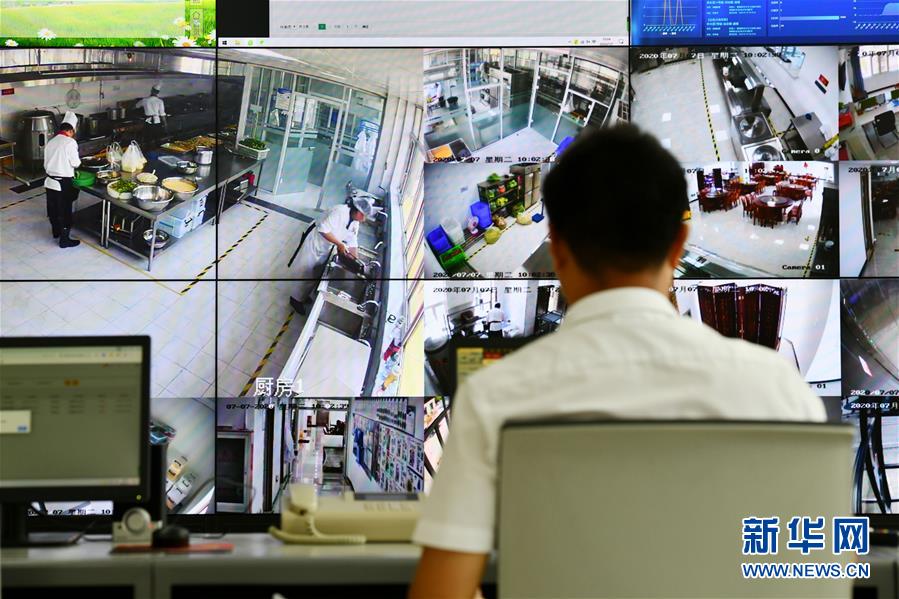 在天津市西青区精武镇付村党群服务中心内,智慧平台控制中心的工作人员在查看老人家食堂的监控画面(7月7日摄)。 新华社记者 李然 摄