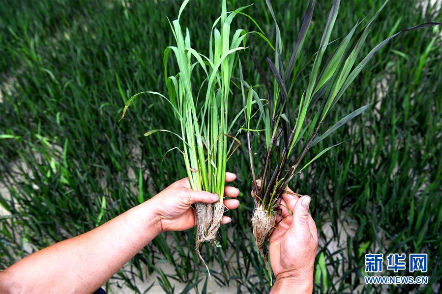 在贵州省榕江县仁里乡太元村的一片秧田里,杨卓林拿黑米秧苗和普通秧苗作比较(6月4日摄)。 新华社发(王炳真 摄)