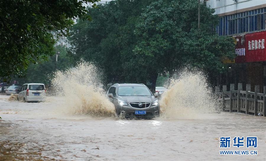 7月8日,在南昌市湾里管理局招贤镇,汽车通过被淹街道。 近日,江西南昌遭遇持续强降雨天气,当地政府抓紧组织开展抢险救援工作。 新华社记者 周密 摄