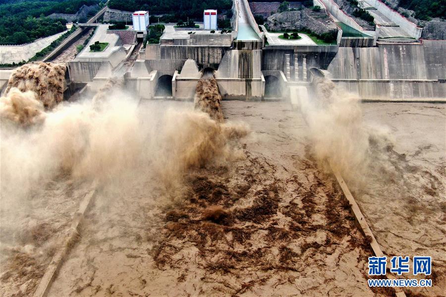 这是7月8日拍摄的黄河小浪底水利枢纽泄洪的场景(无人机照片)。 目前,黄河小浪底水利枢纽正在进行降水位腾库迎汛运用,裹挟着泥沙的水流飞泻而下,蔚为壮观。 新华社记者 李安 摄