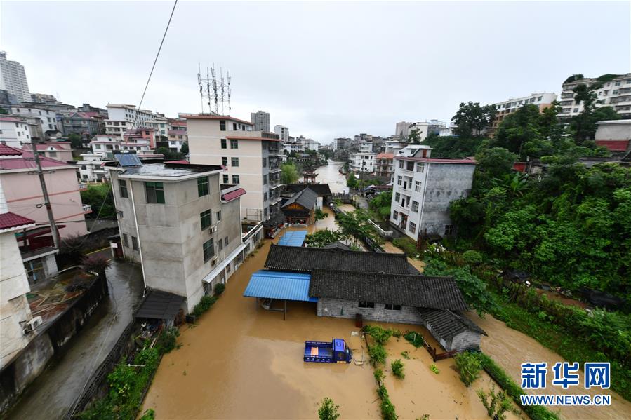 7月8日,在湖南省湘西土家族苗族自治州花垣县花垣镇登高楼社区,民房被洪水包围。 新华社发(龙恩泽 摄)