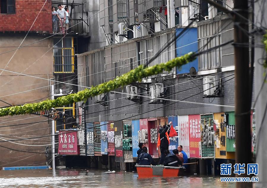7月8日,在景德镇市月丘里小区,救援人员乘坐橡皮艇给受困群众送去物资。 近日,江西景德镇市普降大到暴雨,城区部分地区积水。当地有序开展抢险救援,转移被困群众。 新华社记者 万象 摄