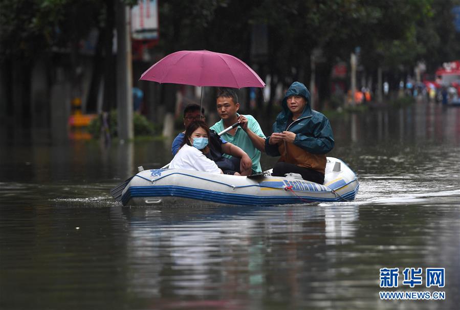 7月8日,在景德镇市瓷都大道,救援人员用橡皮艇转移受困群众。 近日,江西景德镇市普降大到暴雨,城区部分地区积水。当地有序开展抢险救援,转移被困群众。 新华社记者 万象 摄