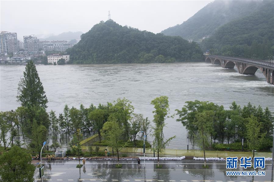 7月8日,建德市部分江边绿树受淹。 7月7日,新安江水库开闸泄洪后,下游浙江建德市部分城区出现积水。 新华社记者翁忻旸摄