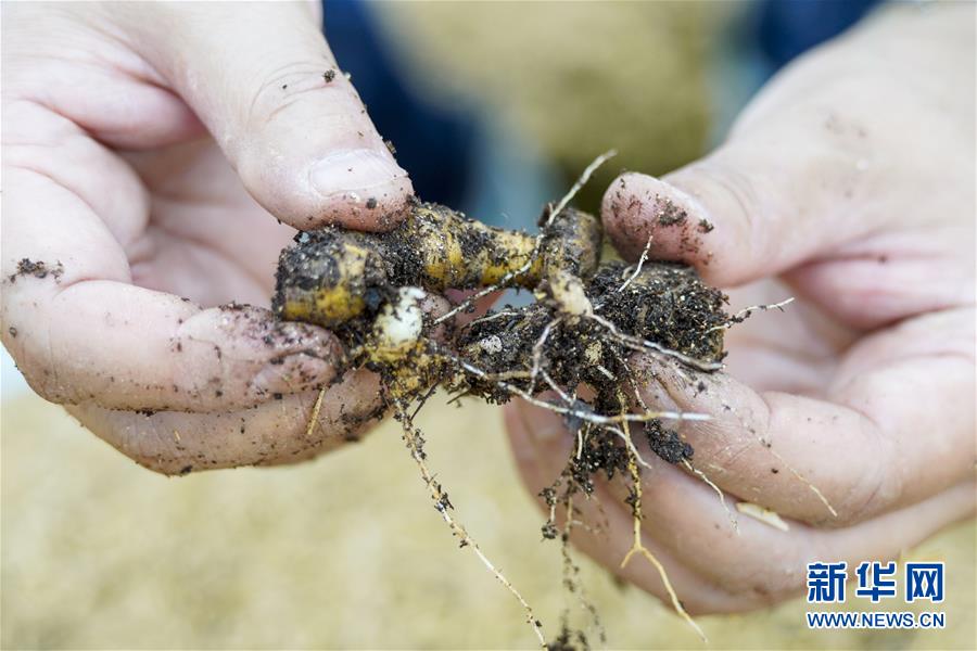7月7日下午,中益乡华溪村驻村第一副书记罗风华在村里的黄精育苗大棚内查看黄精苗长势。 新华社记者 刘潺 摄