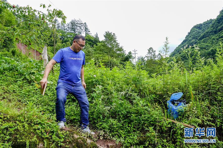 7月7日,中益乡华溪村驻村第一副书记罗风华在湿滑的山路上行走。 新华社记者 刘潺 摄