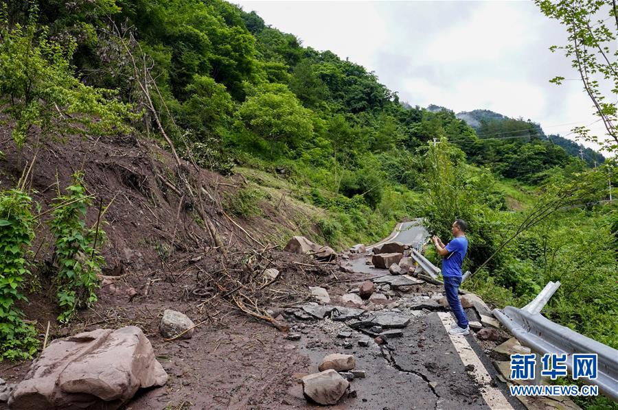 7月7日,中益乡华溪村驻村第一副书记罗风华在华溪村一处因暴雨造成的滑坡点巡查拍照。 新华社记者 刘潺 摄